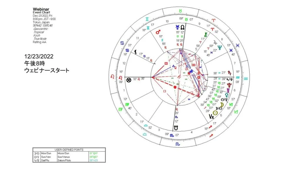 この記事は、2022年12月23日に配信された、意識進化占星学 自動生成プログラム~死と再生の準備編2023 ~のイントロダクション無料Webinar「2023年を最高最善に生きる5つのヒント」をまとめたものです。