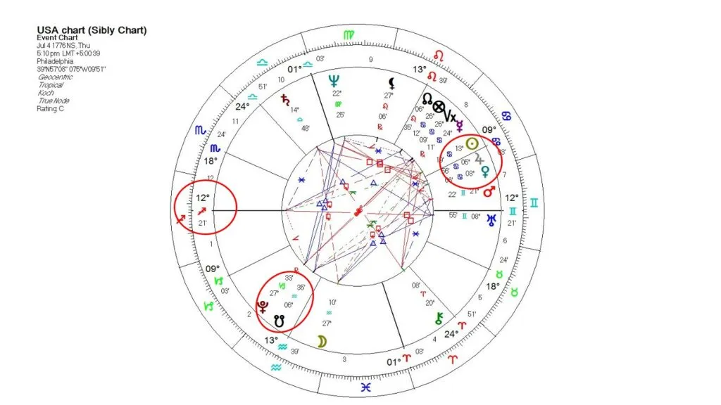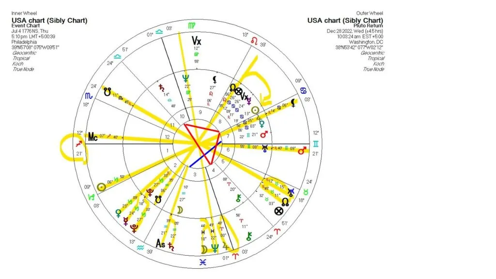 このノースノードは2ハウス、おうし座のテーマがありますが、アメリカはもともと冥王星が2ハウスにあるのです。