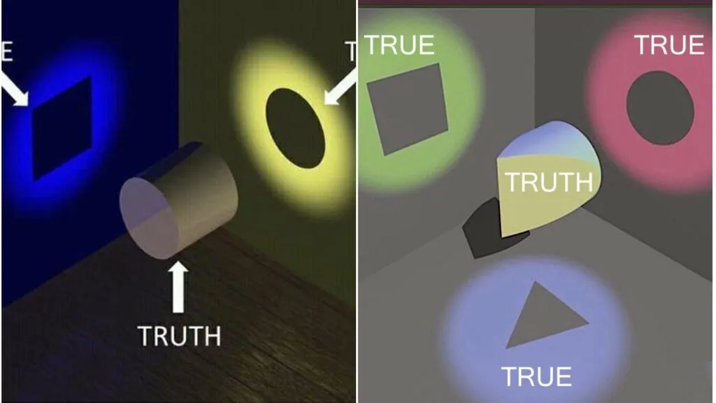 でも、今度は別の方向から光を当てて壁を見ると、影は四角ですから、これは四角だということも正しいのです。