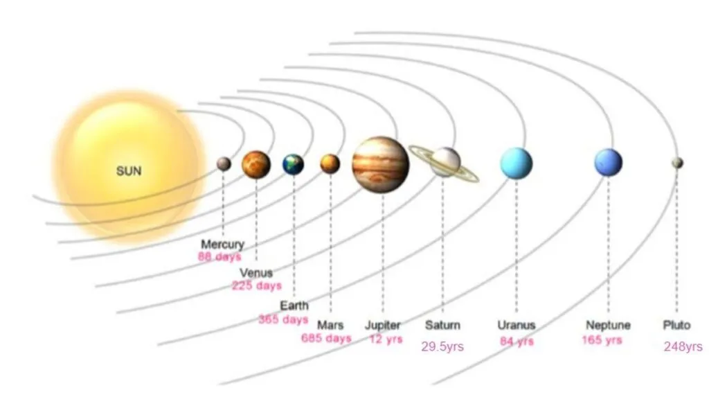 冥王星は大体太陽の周りを248年かけて1周します。海王星は165年、天王星は84年くらいです。