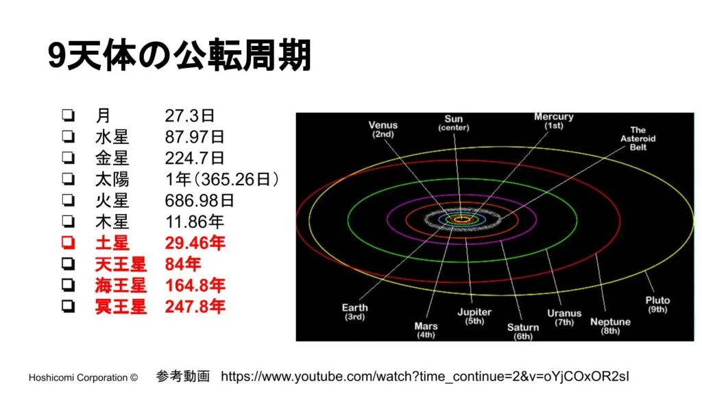 土星はだいたい30年くらいで、天王星は84年、海王星が約165年で、冥王星は248年、250年弱と言ってもいいでしょう。