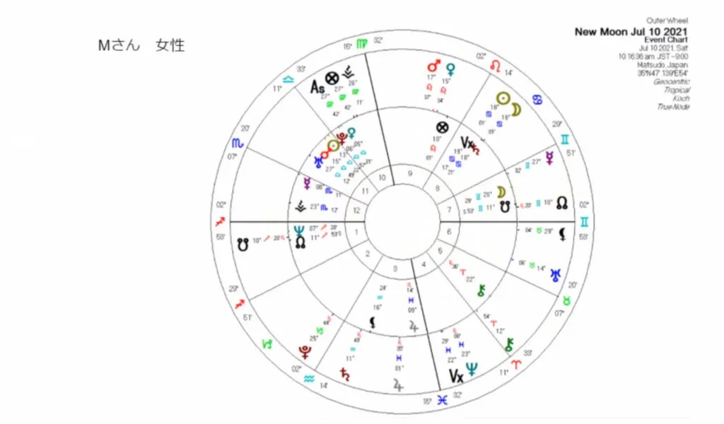 今回のチャートリーディングに選ばれたのは、Mさん、女性です。冥王星がてんびん座の世代ですから、1974年か1975年あたりに生まれた方でしょう。