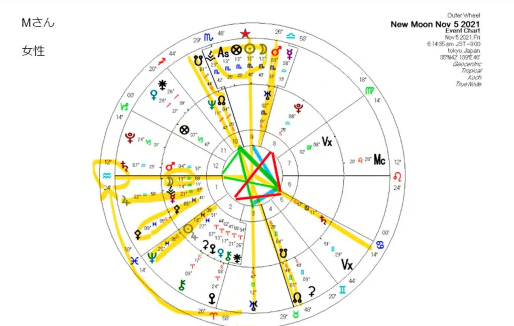 Mさんのネイタルチャートに新月チャートを重ねて読む