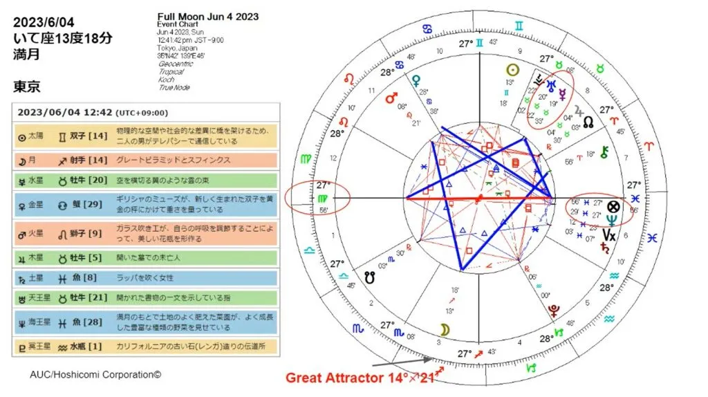 いて座14度21分のところには、グレートアトラクターと言われているとても重力があるブラックホールみたいなところがあります。