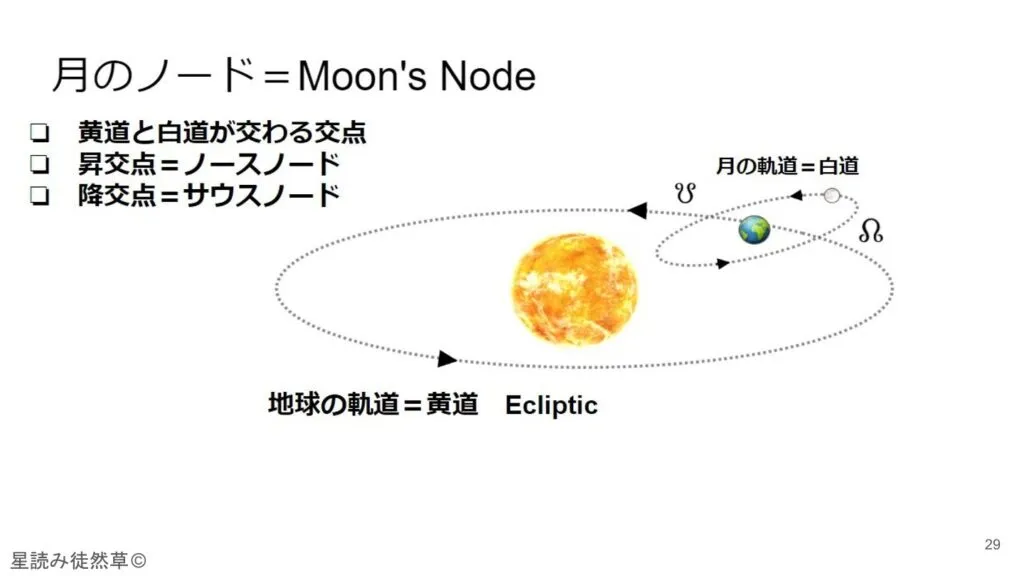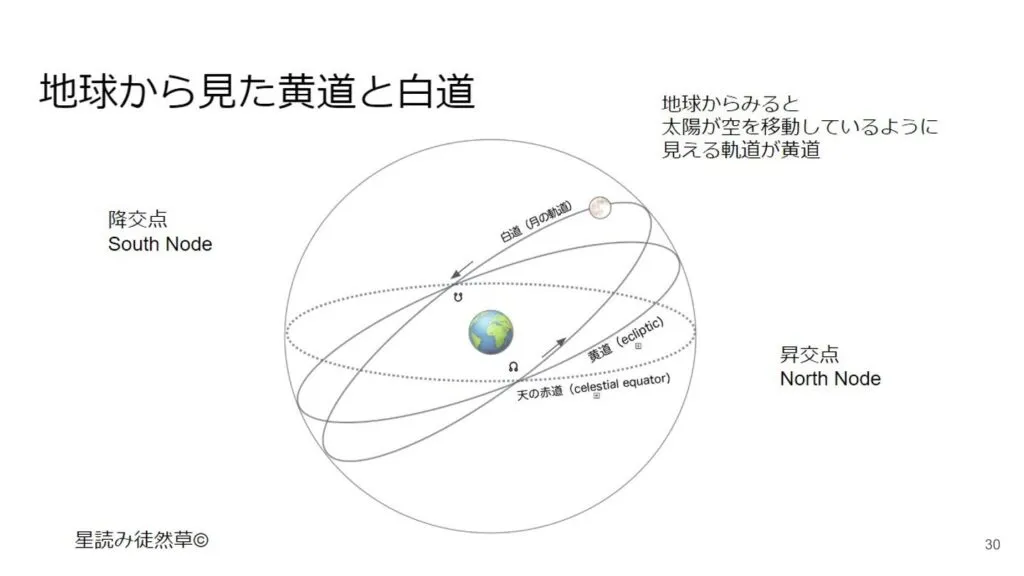 地球から見て、太陽や月が東から昇り西に沈むように、その動きの中で黄道と白道が交差する瞬間が、ノースノードとサウスノードの位置となります。