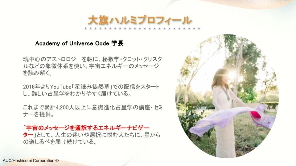 10年くらい前からYouTubeで発信を始め、今はアカデミー・オブ・ユニバース・コードという、日本で意識進化占星学を学べるオンラインスクールの学長をしています。