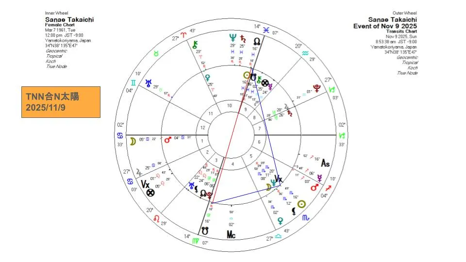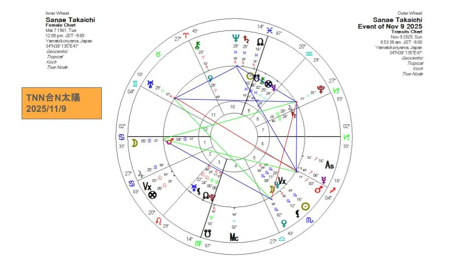 今年(2025年)11月9日前後には、太陽がうお座16度にある高市さんのチャートに、ノースノードがぴたりと重なるタイミングが訪れます。
