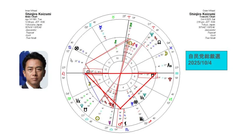 また、外惑星と木星の間にはカイト(のアスペクトもできていて、だからこそ彼は今回、総裁選の最終局面まで進むことができたのだと思います。