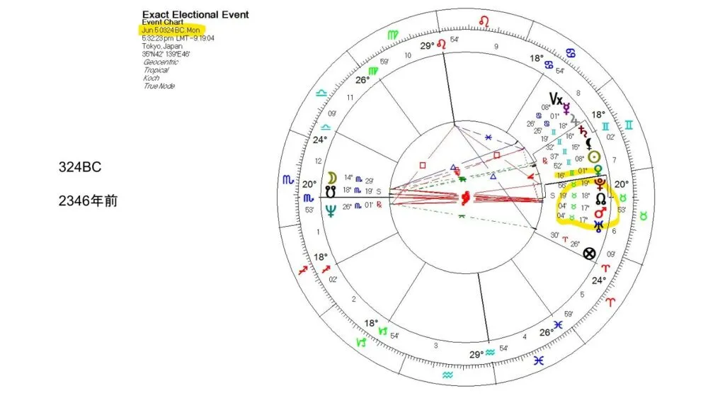 1度だけ違うという惜しい組み合わせが、紀元前324年、今から2346年前に火星と天王星は17度、ノードは18度という1度違いでありました。