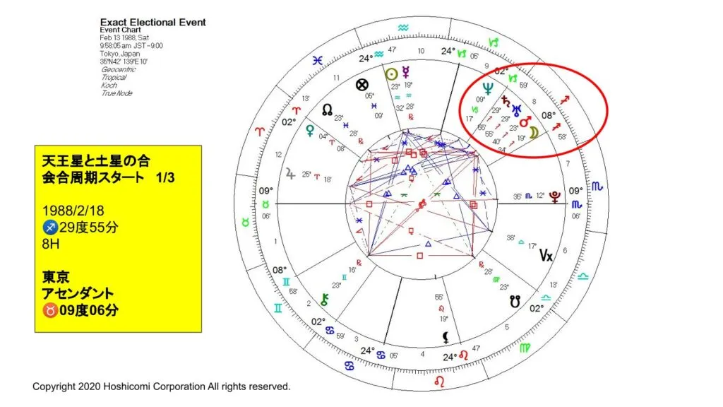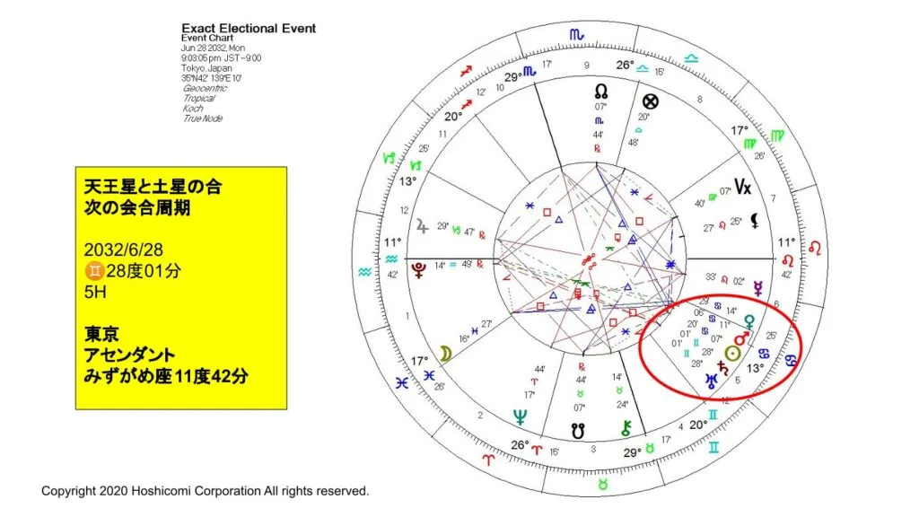 これについては前回のVSPの無料ウェビナーでもう少し詳しくお話しているのですが、この時の天王星と土星の合は2032年6月28日に起こります。