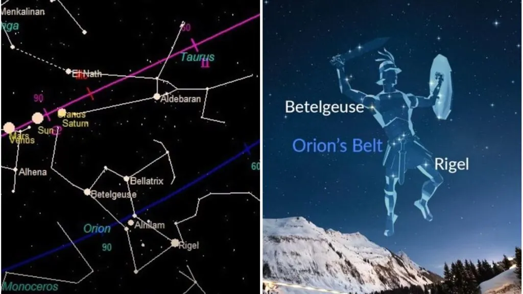 オリオン座を象徴するオリオンが振り上げる右手の上に、太陽と金星と火星までいて、土星と天王星がその近くで重なるのです。