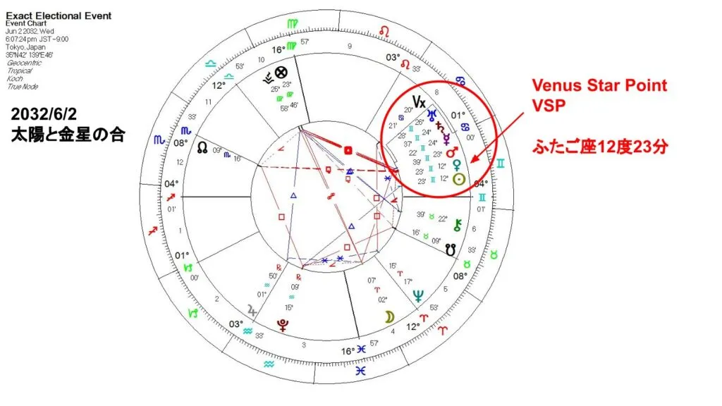 そしてこれはその少し前、2032年6月2日のチャートです。ふたご座12度で金星と太陽が合になって、新しいVSPができています。