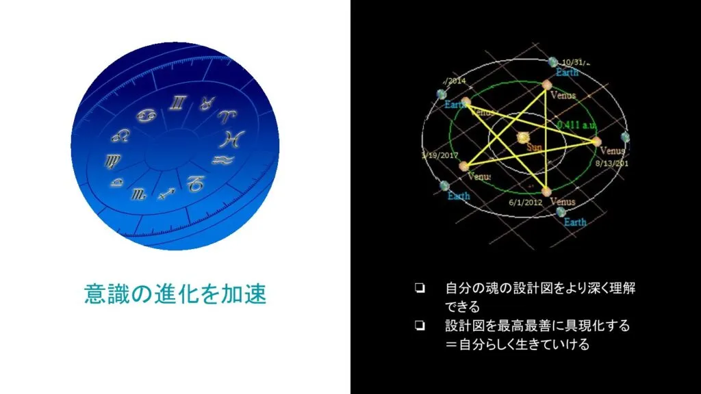 このプログラムで学べることは、ヴィーナス・スター・ポイント(VSP)の基本知識と、意識進化占星学とVSPを統合したチャートの解読をしていく方法です。