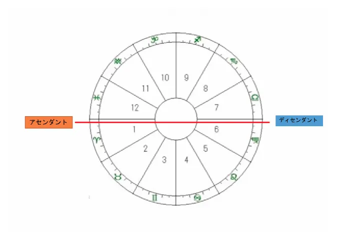 上の図のホロスコープの円を上下に半分に分けるように、左右に伸びた線が水平線です。12ハウスと1ハウスの境界線がアセンダント(東の地平線)、6ハウスと7ハウスの境界線がディセンダント(西の地平線)です。