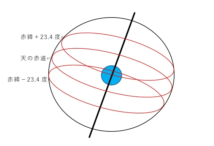 天体は通常、赤緯±23.4度の範囲で運行しています。この図の境界線の幅の間でいろいろな星が動くのです。