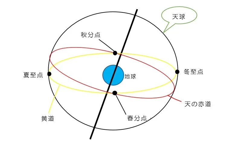 地球の赤道を天球(地球を中心にした時の天体の位置を投影するための仮想の球)に投影したものを「天の赤道」と呼びますが、自転面と公転面のずれ(地軸と公転面の垂線との傾き)がそのまま天の赤道と黄道のずれになります。