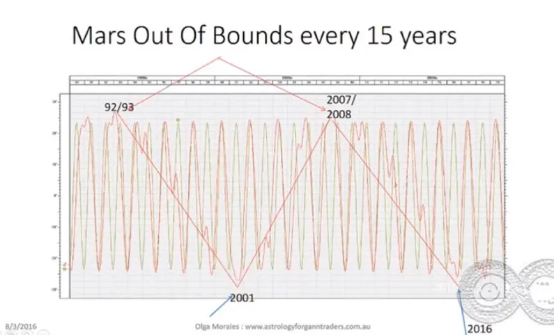 オルガさんの研究によると、火星が大きくOut of boundsに振れるのは、だいたい15年周期のようです。今回例に出したのが2016年ですが、その前は2001年、15年前になります。