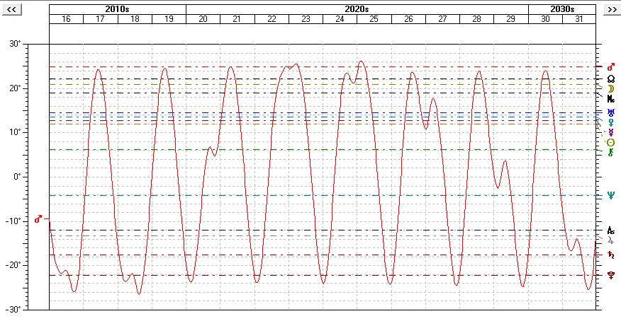 2016年以降、16年間の火星のディクリネーションのデータを調べておきました。今度、北側でピークがやってくるのは2022年後半から2023年前半、および2025年頃ですね。
