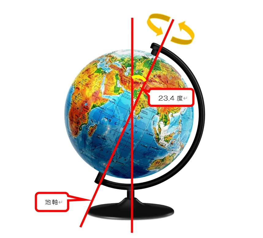 地球儀を見てもらうと、地軸が傾いていることがよく分かりますね。