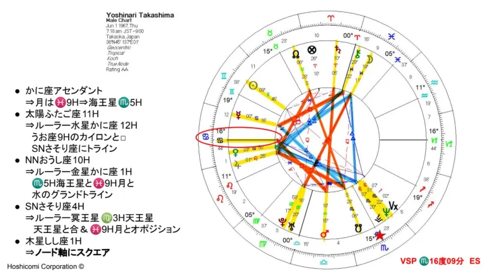 高島先生のチャートは、アセンダントはかに座です。チャートの左側に、見るべきポイントを書いておきました。