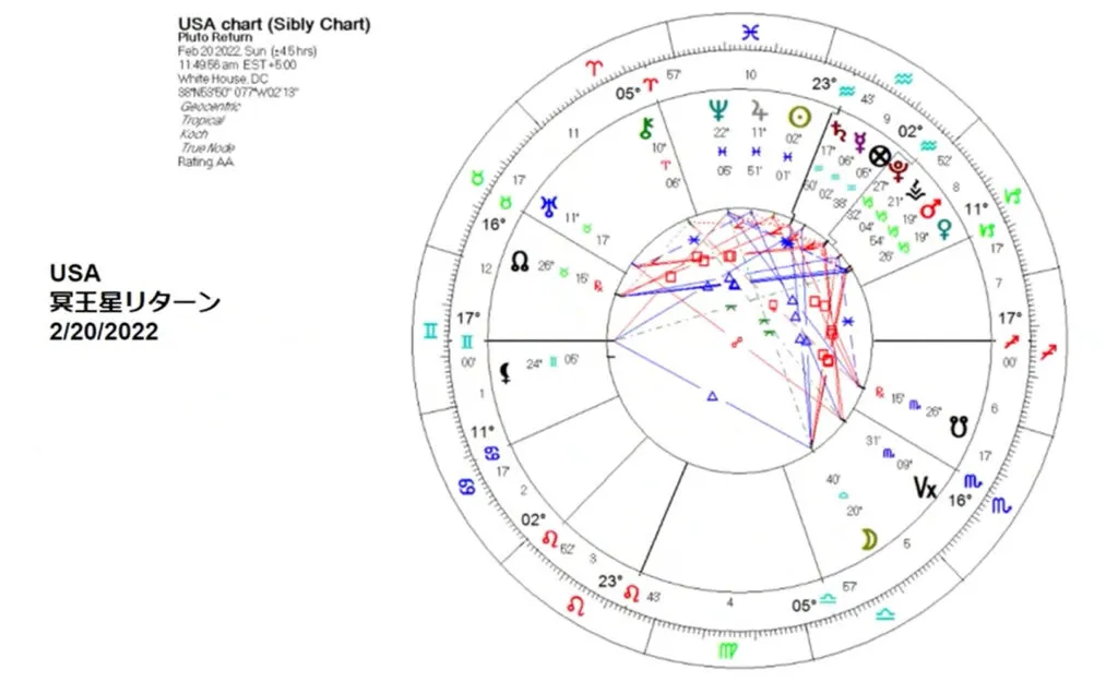 私は数秘学とアストロロジーを一緒に混ぜて解説しています。冥王星が建国の時の27度32分に戻ってくるのは2022年2月20日です。面白いですよね、2・2・2・2・2ですよ!