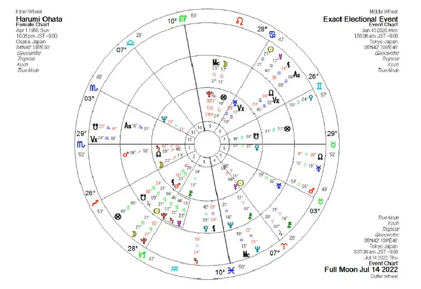 私のチャートに、土星と冥王星の合があった1月の時のチャート、それから今回の満月を比べて三重円にしてみました。