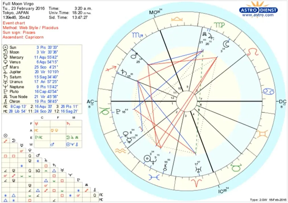 それを2016年2月23日東京で取った時の満月のホロスコープから見てみましょう。この時は8ハウスに月があって、2ハウスに太陽がありました。うお座とおとめ座になります。