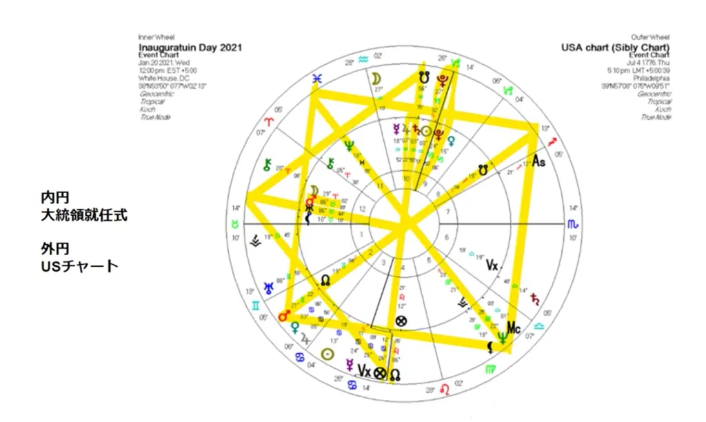 今日の大統領就任式と建国のチャートを一緒に合わせてみるとこうなります。