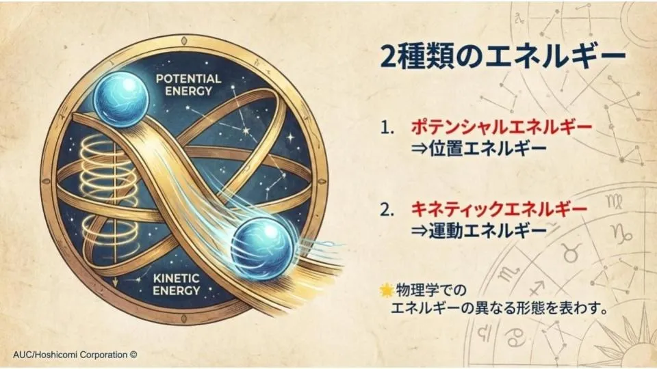 物理学では、エネルギーには「ポテンシャルエネルギー(位置エネルギー)」と「キネティックエネルギー(運動エネルギー)」の2種類があると言われています 。