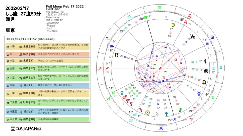満月ですから、太陽はみずがめ座27度59分。あと1分で28度ですが、まだ27度・・・というところですね。