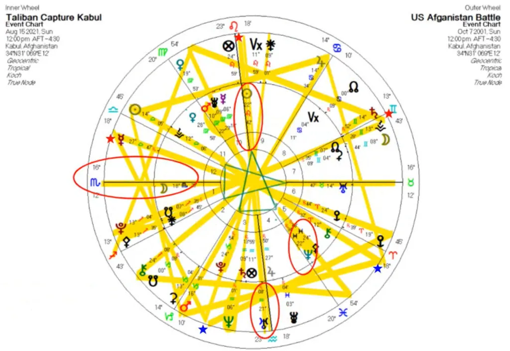今回のタリバンのカブール侵攻もここに合わせて、三重円を作ってみたら、カブール侵攻の時は太陽も22度だし、月も22度だし、私が言わなくても分かると思うので、面白いのでよかったらご自分でチャートを読んでみてください。