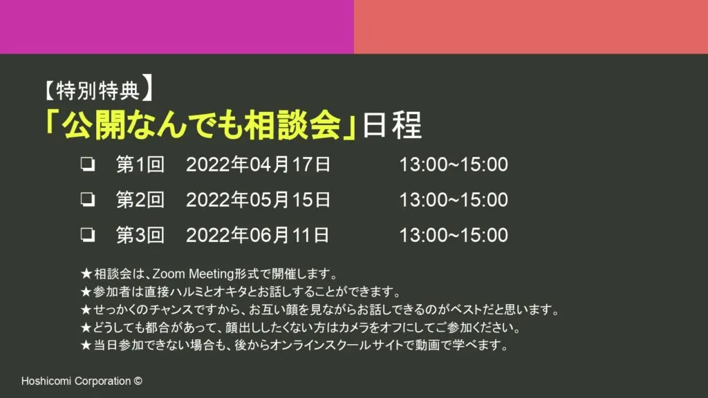 これはZoomミーティングで皆さんと一緒になって、お互いにお顔を見ながらオキタさんと私が、みなさんからのご相談や質問に答える会です。