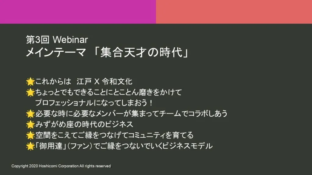 だから空間を超えて、ご縁をつなげてコミュニティに参加しながら、「御用達」でつなぐビジネスモデルとはどのような生き方かということです。